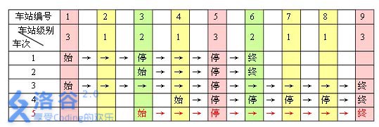 例如,下表是 $5$ 趟车次的运行情况。其中,前 $4$ 趟车次均满足要求,而第 $5$ 趟车次由于停靠了 $3$ 号火车站( $2$ 级)却未停靠途经的6号火车站(亦为 $2$ 级)而不满足要求。